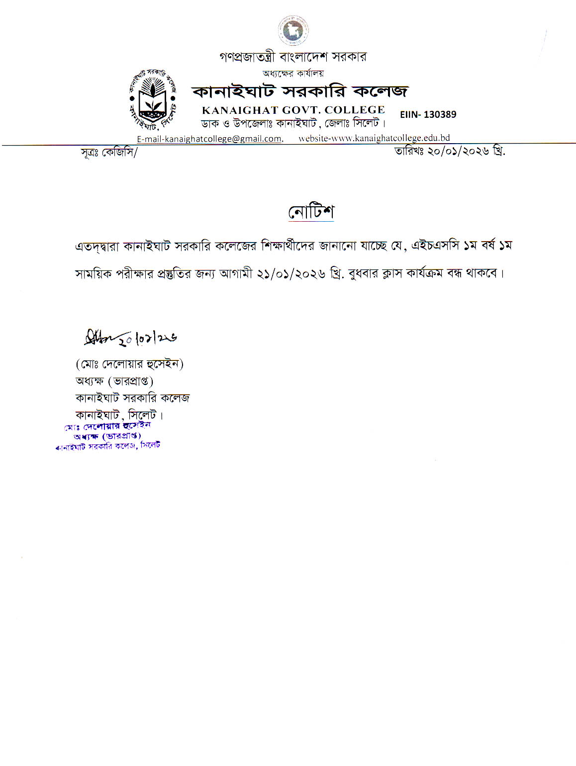 কলেজের ক্লাস কার্যক্রম বন্ধ সংক্রান্ত বিজ্ঞপ্তি।