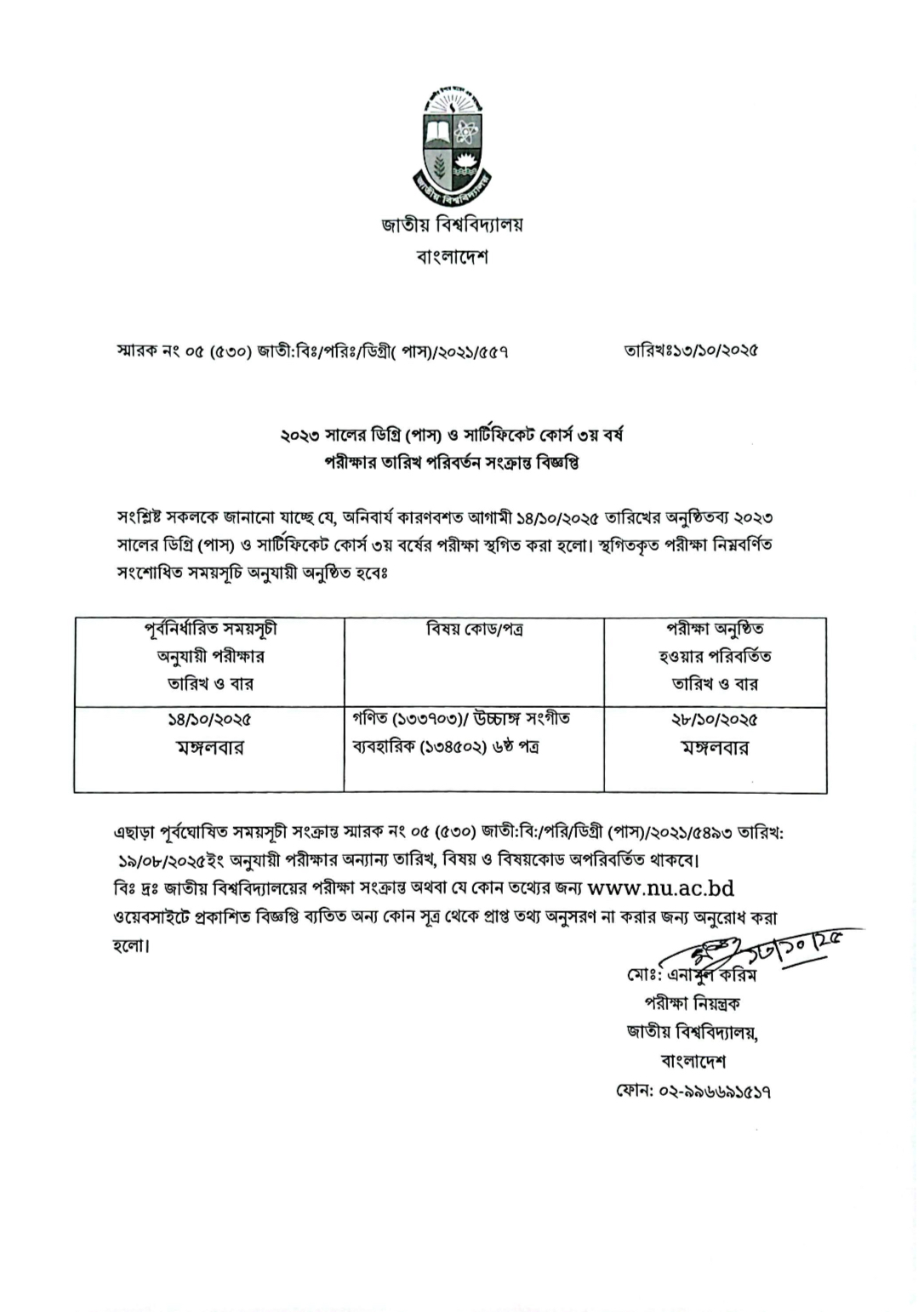 ২০২৩ সালের ডিগ্রি (পাস) সার্টিফিকেট কোর্স ৩য় বর্ষ পরীক্ষার তারিখ পরিবর্তন সংক্রান্ত বিজ্ঞপ্তি
