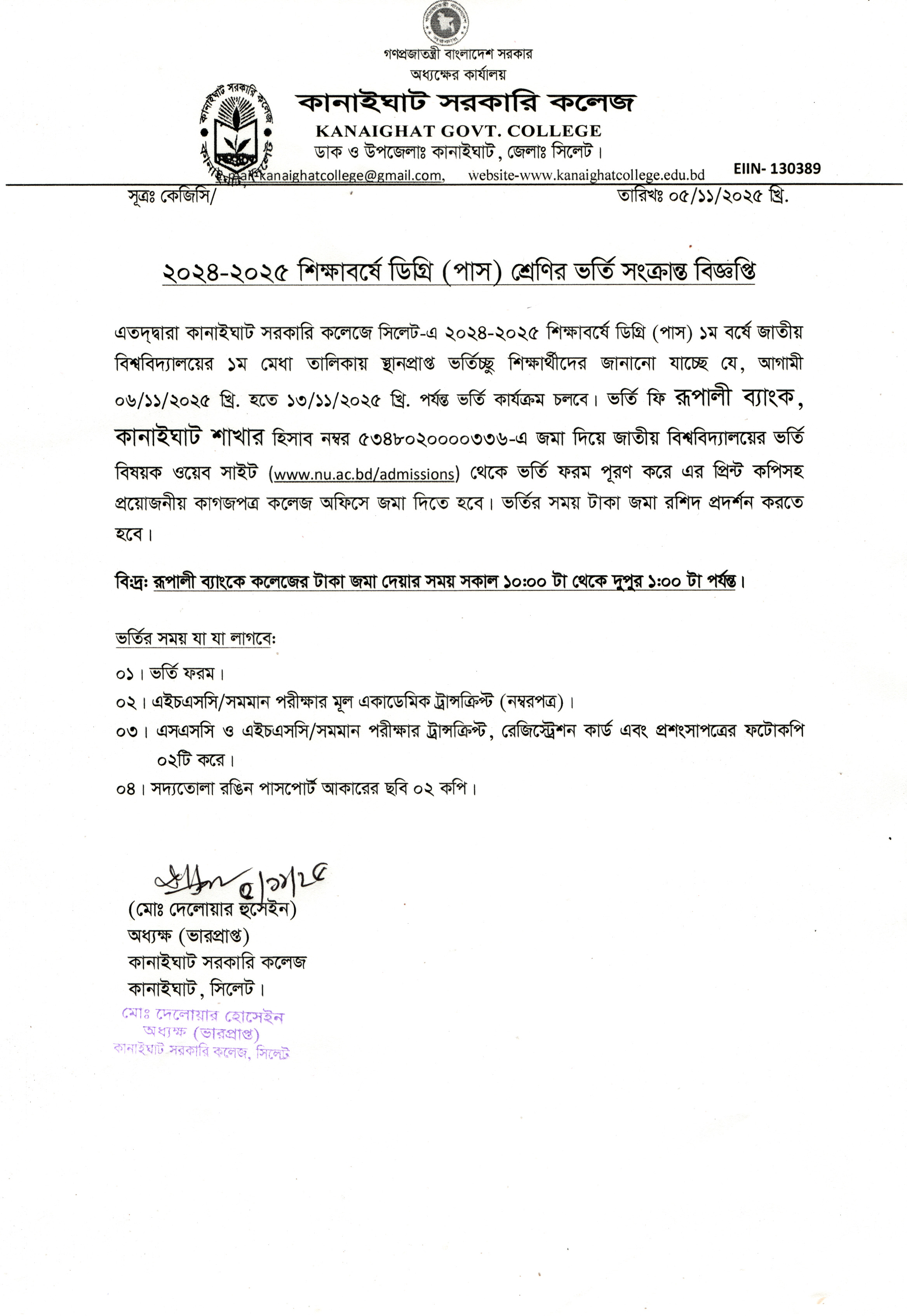 ২০২৪-২০২৫ শিক্ষাবর্ষে ডিগ্রি (পাস) শ্রেণির ভর্তি সংক্রান্ত বিজ্ঞপ্তি।