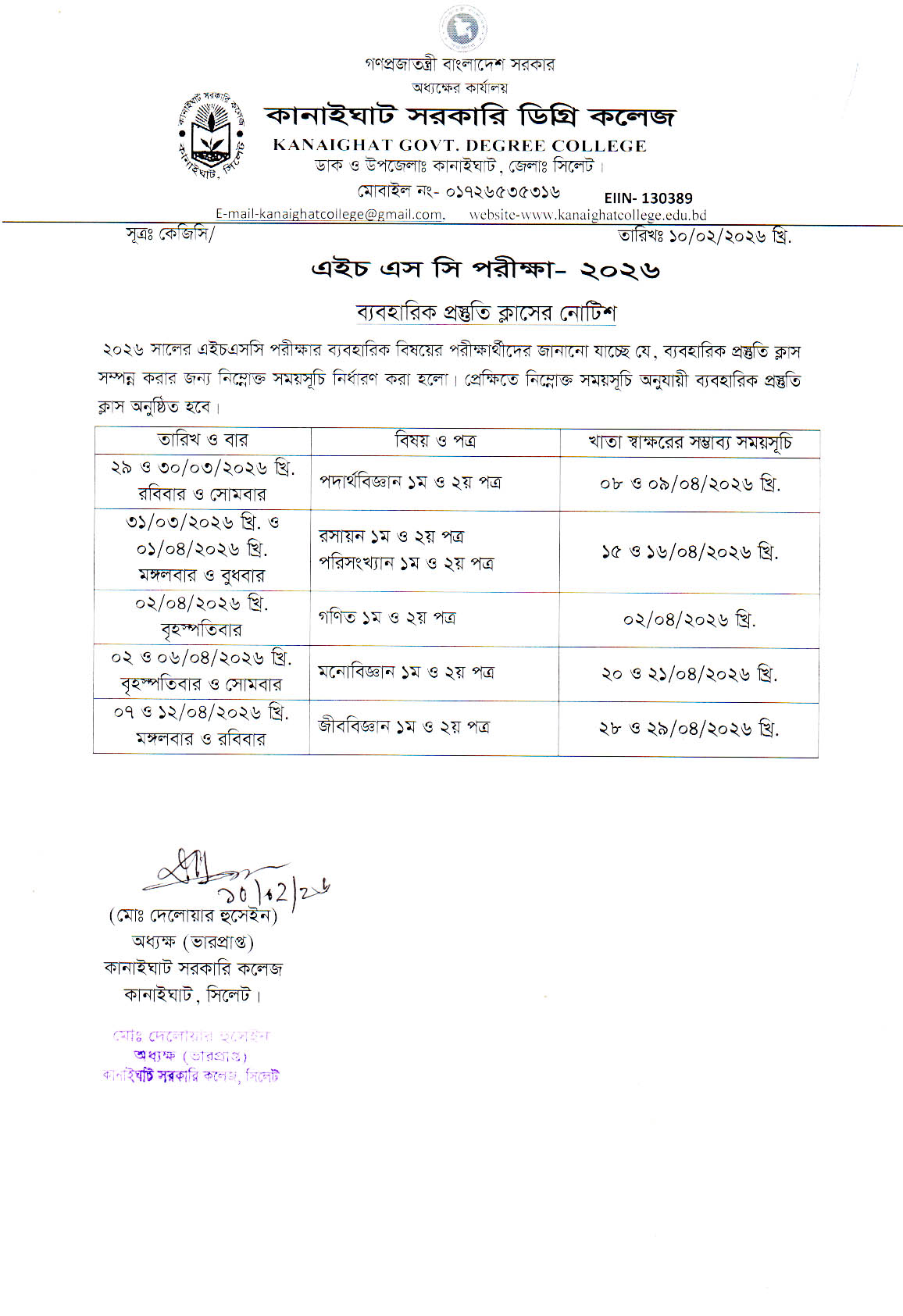 ব্যবহারিক প্রস্ততি ক্লাস সংক্রান্ত বিজ্ঞপ্তি।