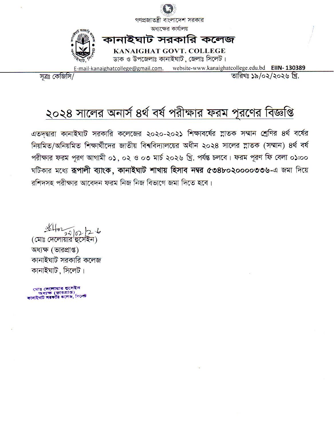 ২০২৪ সালের অনার্স ৪র্থ বর্ষ ফরম পূরণ সংক্রান্ত বিজ্ঞপ্তি।